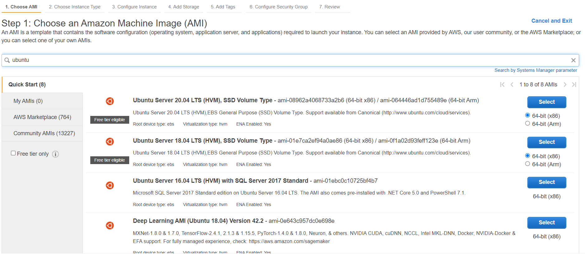 Açılan sayfada EC2 üzerinde çalıştırabileceğiniz işletim sistemleri ve farklı dağıtımlar listelenmektedir. Buradan ihtiyacınız doğrultusunda gerekli seçimi yapabilirsiniz. Ben makalede Ubuntu ile göstereceğim için siz de arama yerine “Ubuntu” yazıp çıkan sonuçlardan güncel olan dağıtımı seçebilirsiniz. Gördüğünüz gibi Ubuntu makineyi 1 yıllık süremiz boyunca limitler dahilinde ücretsiz olarak oluşturabiliyoruz.