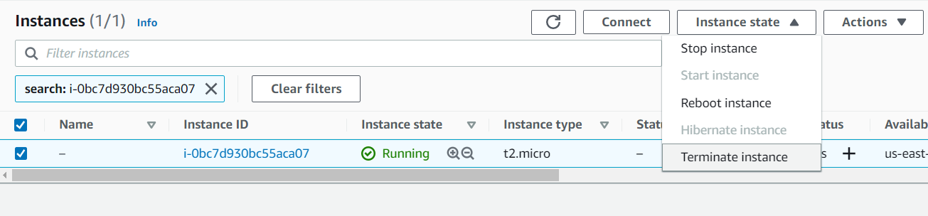 Panelden makineyi seçip üst menüde “Instance State” altında yer alan “Terminate instance” ‘a tıklayın.