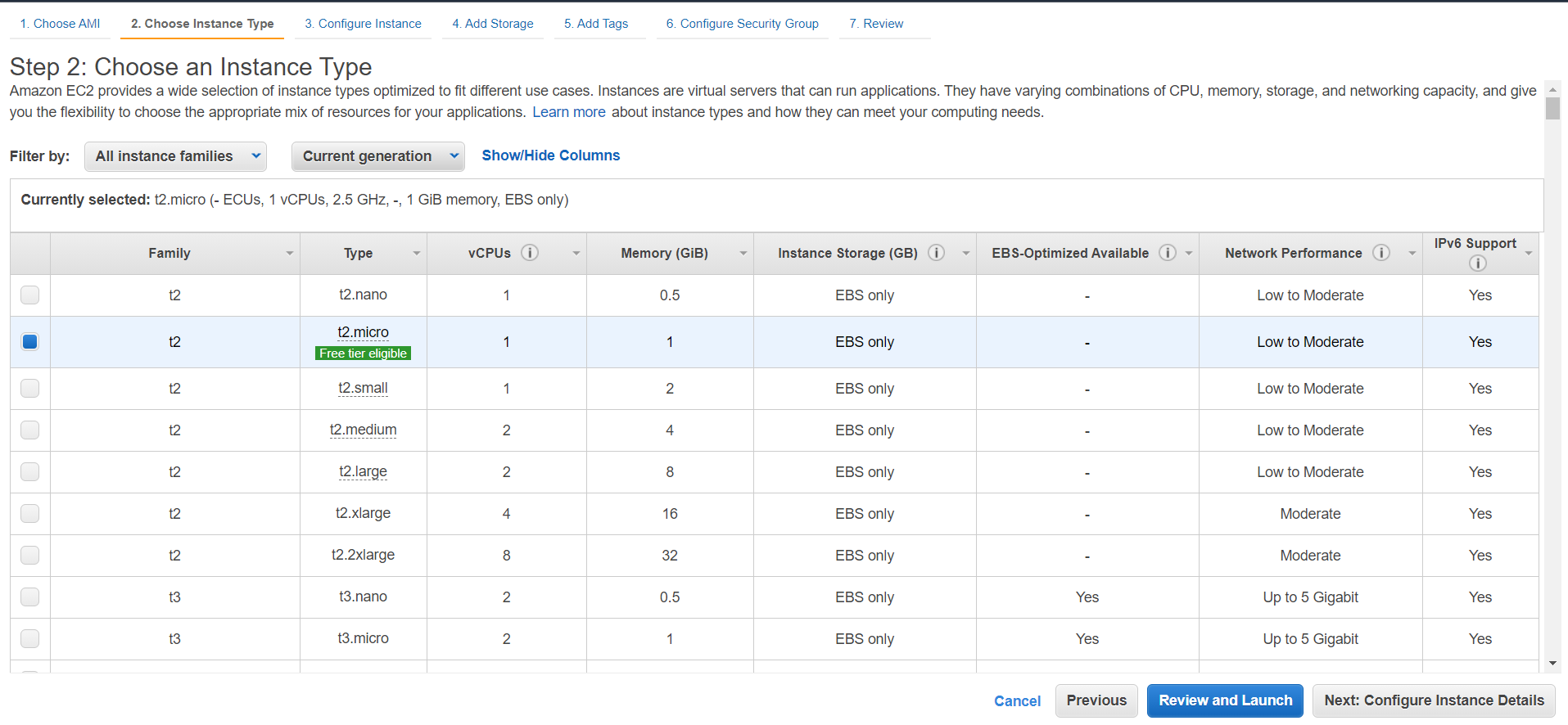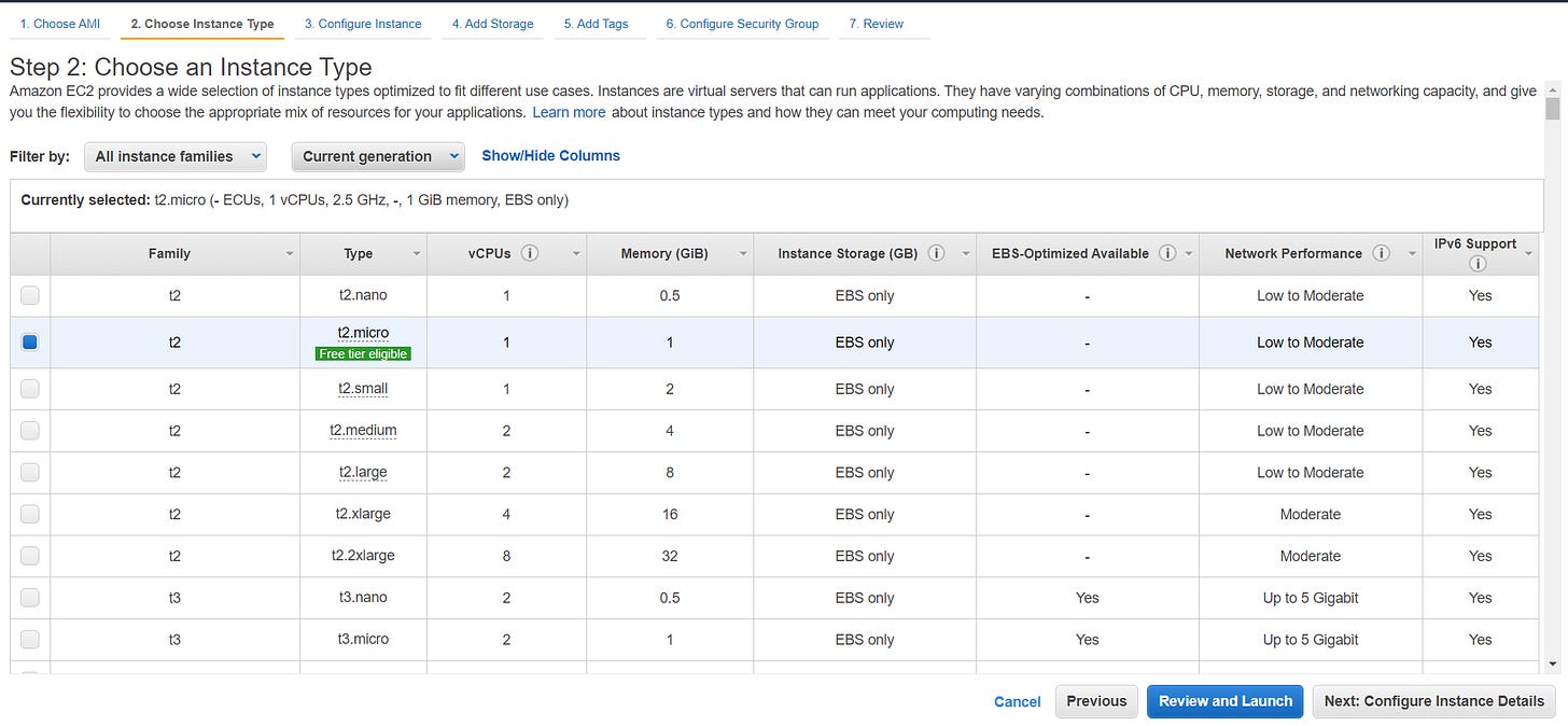 Oluşturmak istediğimiz makineye ait donanım özelliklerini bu ekrandan seçebiliyoruz. Eğer ücretsiz verilen haklarınız dahilinde bir kullanımda bulunmak istiyorsanız “Free tier eligible“ ile belirtilen opsiyonu seçmeniz gerekiyor. Diğer sunulan opsiyonlardan bir seçimde bulunursanız AWS tarafından belirlenen saatlik ücret dahilinde bir fatura ay sonunda hesabınıza yansıtılır.