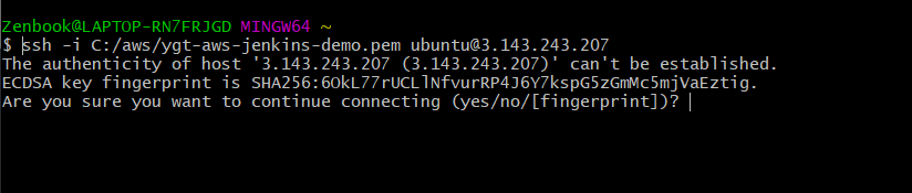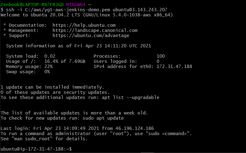 ssh -i {indirdiğiniz pem dosyasının konumu} ubuntu@{makinenizin IP adresi}Ben aşağıdaki gibi bağlandım;