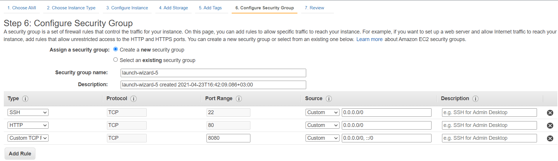Bu ekranda “Review and Launch“ butonu ile doğrudan son aşamaya ilerleyebilirsiniz. Fakat biz bir web sitesi yayınlamak istediğimiz için sunucuya gelecek olan isteklere ait portları güvenlik adımından açmamız gerekmekte. Bunun için isterseniz “Next“ butonlarıyla veya yukarıdaki menüden direkt olarak “Configure Security Group“ başlığına tıklayarak güvenlik sayfasına gelelim.