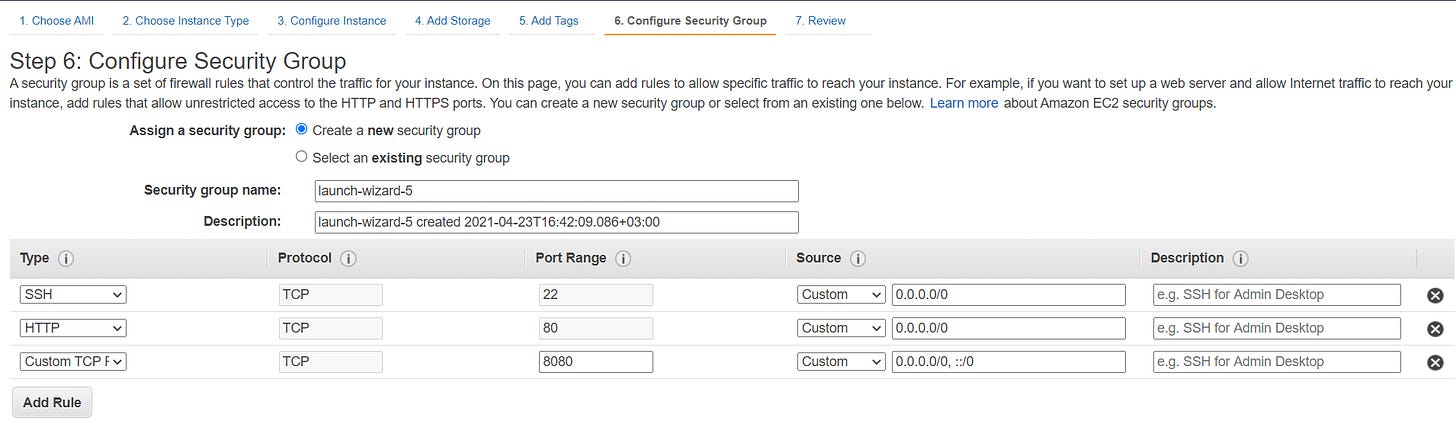 Burada gelen HTTP isteklerini karşılaması için 80 portunu, Jenkins’e erişim sağlayabilmemiz için de 8080 portunu dışarıdan gelen tüm isteklere açıyoruz.