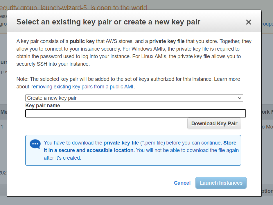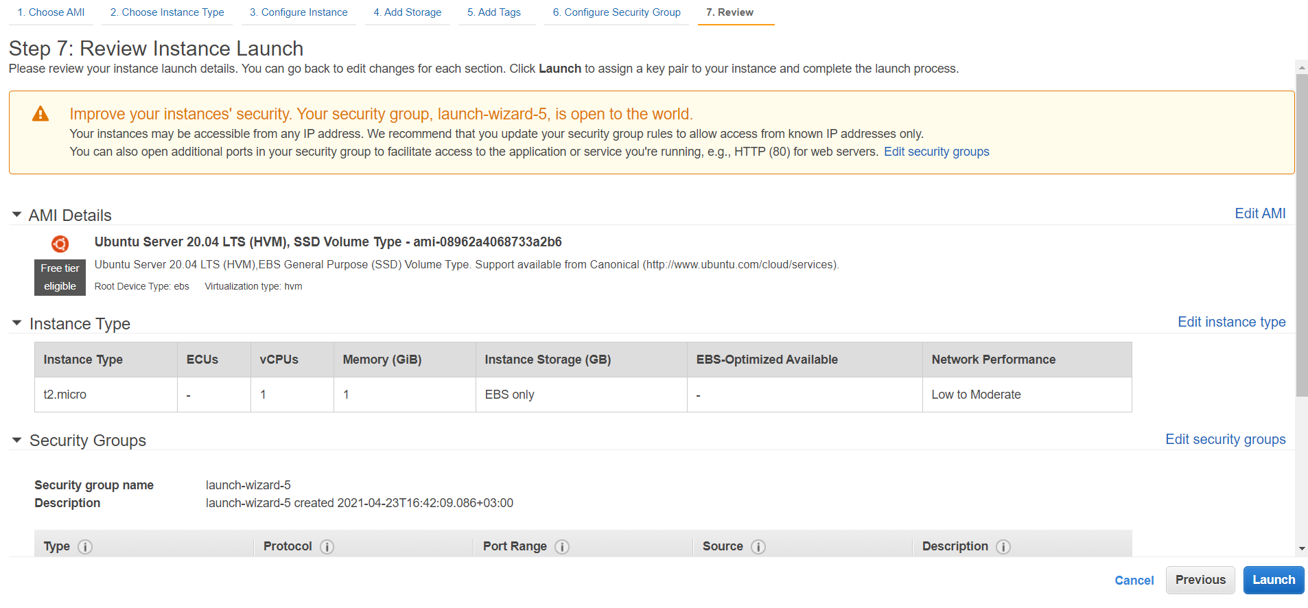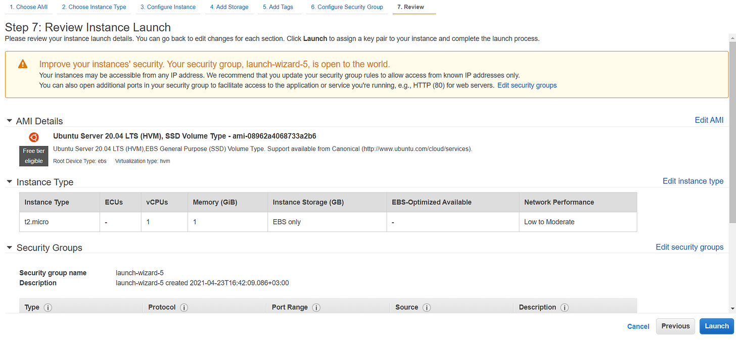 Burada Amazon da bizi makinemizin tüm internet erişimine açık olduğu konusunda bizi uyardığını görebilirsiniz. Burada seçimlerinizi gözden geçirip “Launch“ butonuna tıklayabilirsiniz.