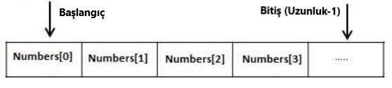 Örneğin Numbers isminde bir dizimizin olduğunu düşünelim. Dizilerde ilk eleman her zaman 0. İndekstir. Dizinin ilk elemanına erişmek veya yazmak istediğimizde Numbers[0] yazmamız gerekmektedir. Diğer elemanları için de sırasıyla Numbers[1], Numbers[2] şeklinde yazmamız gerekmektedir. Buradaki bir diğer önemli nokta da dizimizin ilk elemanı 0. İndeksten başladığı için son elemanı da oluşturduğumuz uzunluğun bir eksiğidir.