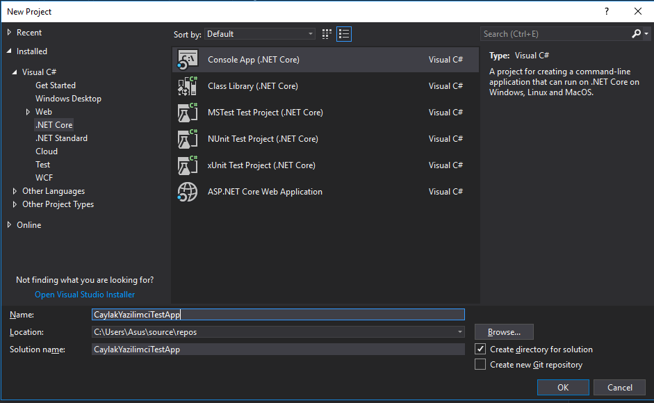 Visual Studio ile yeni proje oluşturma ekranında “.NET Core” seçtiğimizde bize oluşturabileceğimiz şablon önerilerini görebiliriz. Gördüğünüz gibi, kendi kütüphanelerimizi (class library), asp.net core web projelerimizi, testlerimizi ve konsol uygulamalarımızı yazabiliriz. Biz “Console App(.NET Core)”‘a tıklıyoruz.