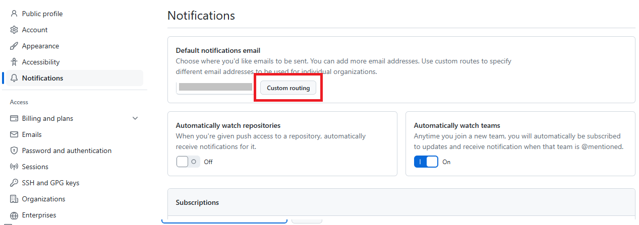 2. Yine Github ayarlar sayfasında, bu sefer “Notifications” sayfasına gelin. Buradan da aşağıdaki “Custom routing” butonuna tıklayın.