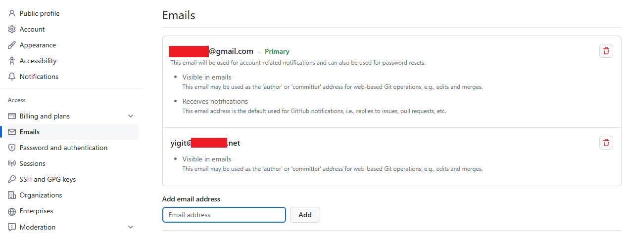 1. İlk olarak email almak istediğiniz adresin Github’da doğrulanmış bir şekilde eklemeniz gerekmekte. Bunun için hesabınıza giriş yapıp ayarlar kısmına girip, sol menüden “Emails” sekmesine gelmelisiniz. Buradan direkt ulaşabilirsiniz.
