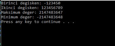 İnt değişkeni -2.147.483.648 ile 2.147.483.647 arasında değer depolayabilmektedir.