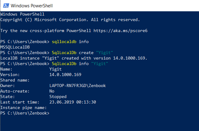 SqlLocalDb info “Yigit”Gördüğünüz gibi sunucumuza ait servis durumları “State: Stopped” olarak yazmakta. Veritabanı işlemlerimizi yapabilmemiz için servisleri çalıştırmak için aşağıdaki komutu çalıştırmamız gerekmekte.