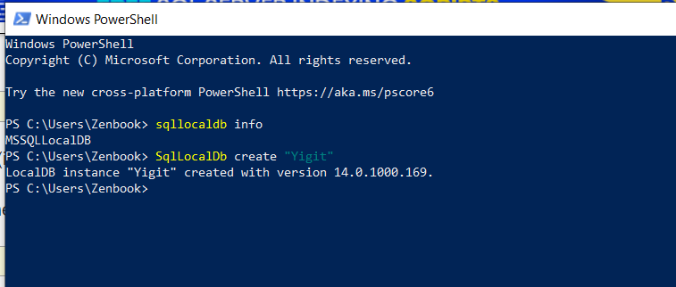 sqllocaldb infoŞimdi sıra kullanacağımız LocalDB sunucumuzdaki ismi tanımlamaya geldi. Burada vereceğimiz isim local veritabanı erişimi gerektiren uygulamalarımızın bağlantı satırlarında(connection string) ve SQL Server Management Studio üzerinden de erişirken kullanacağız. Vereceğimiz isim “(localdb)/{yeni_isim} “ şablonunda yer alacak. Ben kullanacağım veritabanına kendi ismimi vereceğim. Sizde aşağıdaki komutu kendinize göre düzenleyip çalıştırın.
