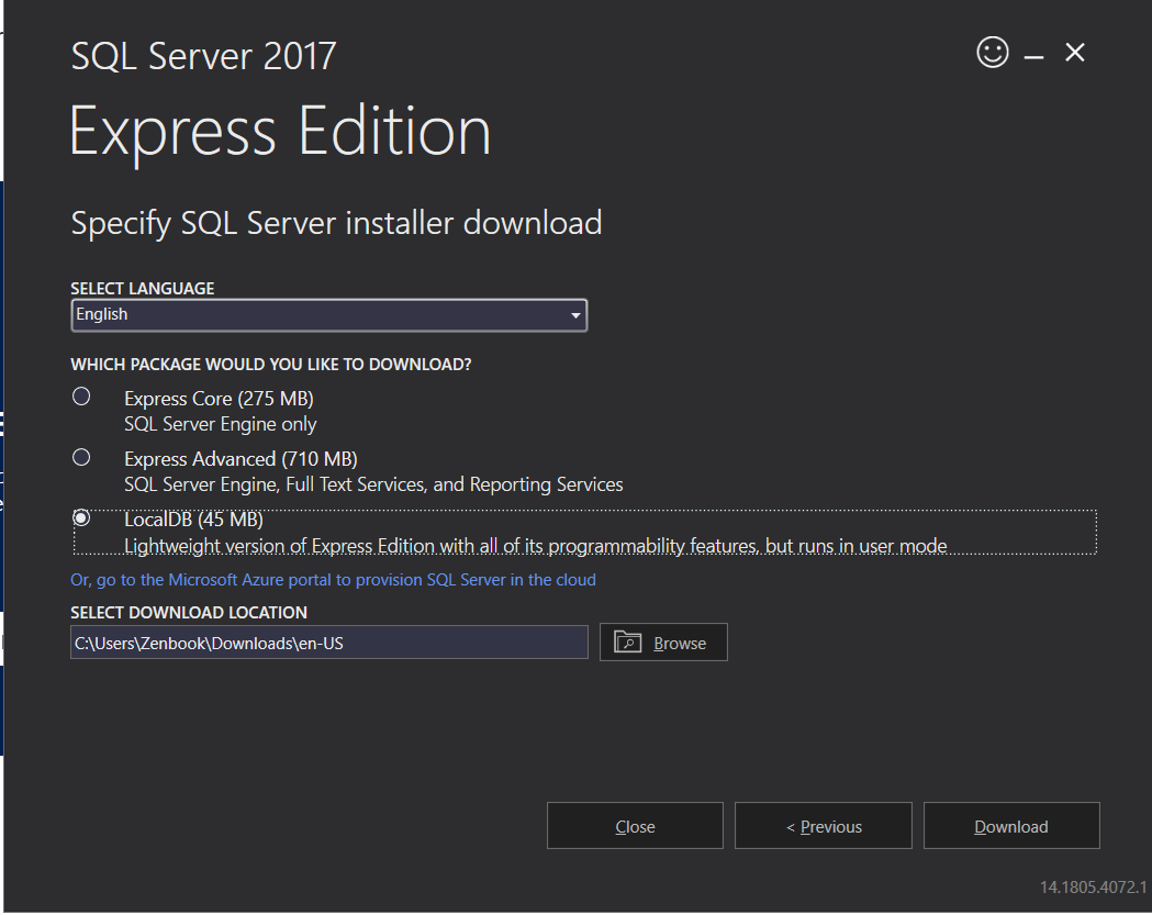 Bir sonraki ekranda dil ile beraber hangi paketi kurmak istediğimiz soruluyor. Burada bizim işimize yarayacak olan “LocalDB“ seçeneğini seçelim. Son olarak seçtiğimiz paketi indirecek bir dizin seçmemiz isteniyor.