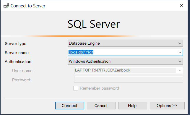 Bilgisayarımızdan bir test bağlantısı yapmak için SQL Server Management Studio uygulamasını çalıştırıp yeni sunucu bilgilerimizi (localdb)\{verdiginiz_isim} formatında aşağıdaki gibi seçip bağlanıyoruz.