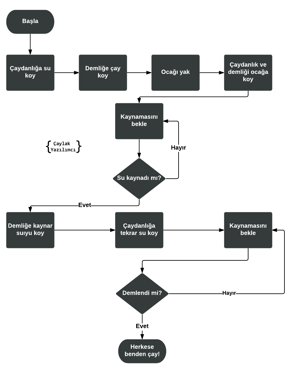 Örnek olarak çay demleme üzerine bir algoritma geliştirelim.