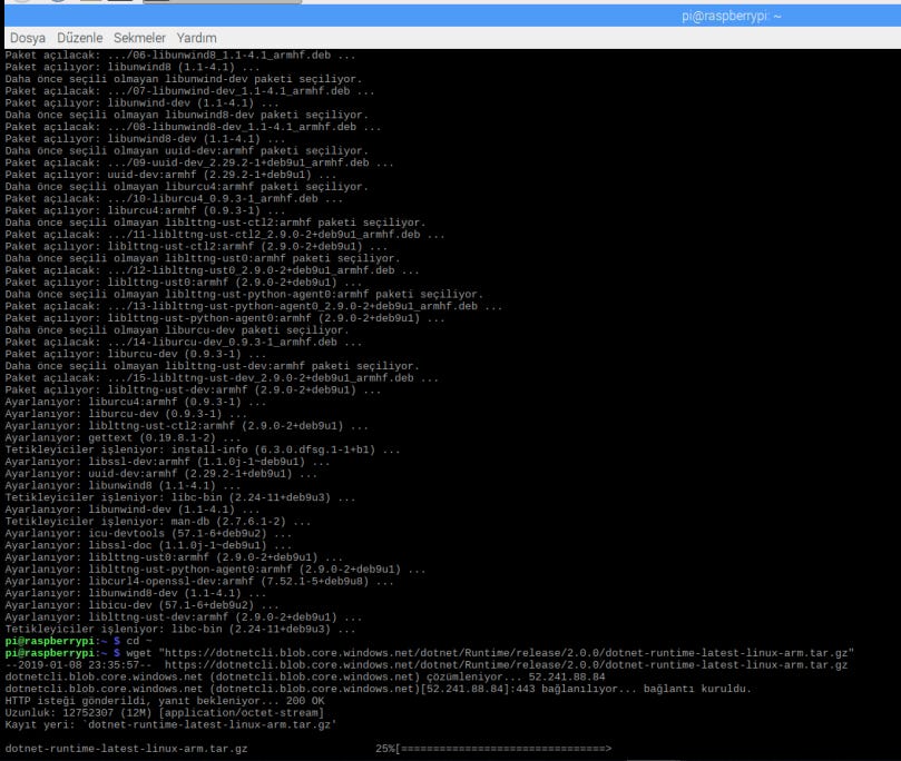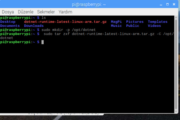 cd ~wget “https://dotnetcli.blob.core.windows.net/dotnet/Runtime/release/2.0.0/dotnet-runtime-latest-linux-arm.tar.gz”İndirme işlemi tamamlandıktan sonra paketi çıkartmak için bir klasör oluşturalım.