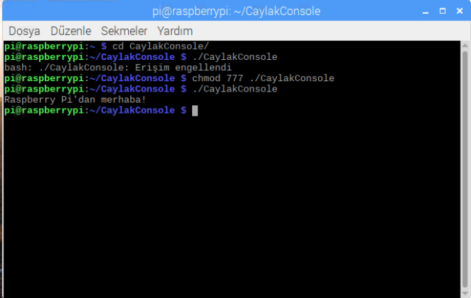 chmod 777 ./CaylakConsoleTekrardan projeyi çalıştırmak için aşağıdaki komutu çalıştırdığımızda mesajımızı terminalde göreceğiz.