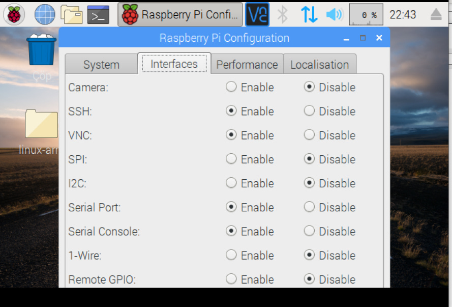 Ardından açılan menüde, “Interfaces” tab’ı altında SSH ve VNC özelliğini “Enable” yapıp, sistemin yeniden başlatmasını sağlayalım.