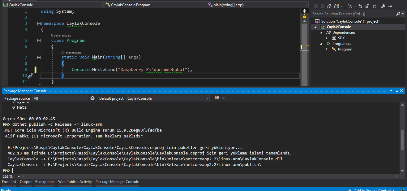 dotnet publish -c Release -r linux-armDerleme sonucu oluşan dosyalarımızı Raspberry pi (bizim projemizde “CaylakConsole\bin\Release\netcoreapp2.2\linux-arm” dizini altındaki publish klasörünü) raspberry pi da “home/pi” altına kopyalayalım.