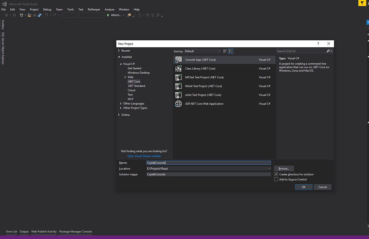 Bunun yeni bir proje oluşturup, sırasıyla Visual C# > .NET Core > Console App (.NET Core) seçip projemizi açalım. Bu makale için CaylakConsole proje ismini kullanacağız.