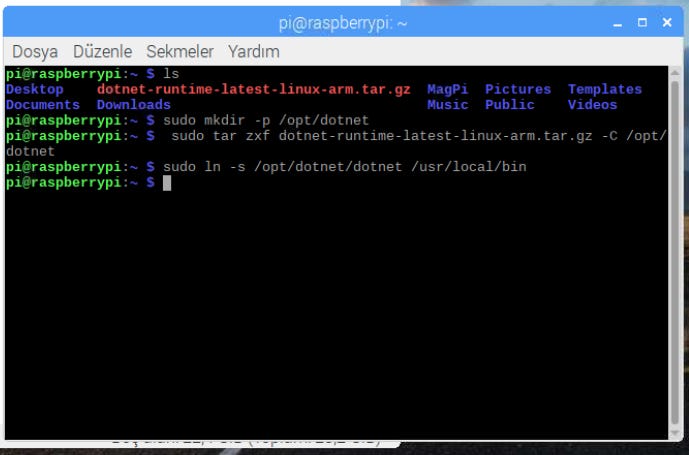 sudo tar zxf dotnet-runtime-latest-linux-arm.tar.gz -C /opt/dotnetÇıkartma işlemi tamamlandıktan sonra da aşağıdaki komutunu çalıştıralım.