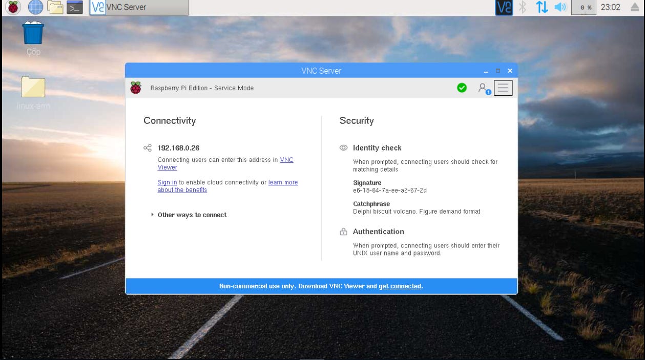 Uzak masaüstü bağlantısını yapmak için VNC server’ı açıp, “Connectivity” altında yer alan IP adresimizi bağlanmak için kullanacağız.