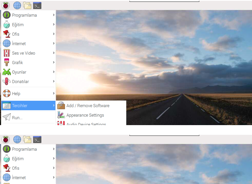 Eğer Raspberry Pi çalışırken sürekli ekran ve klavye bağlamak zor oluyorsa, uzaktan bağlantı özelliğini açabilirsiniz. Bunun için terminale başlat simgesine tıkladıktan sonra Tercihler -> Raspberry Pi Configuration seçmemiz gerekiyor.