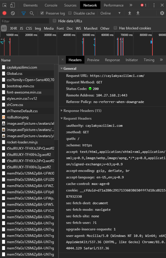 Kullandığınız bowser’ın geliştici seçenekleri(F12) içerisinde Network tab’I altında arkaplanda yapılan istekleri inceleyebilirsiniz. Örneğin bu siteye girerken yaptığınız bir anasayfa isteği aşağıdaki gibidir;