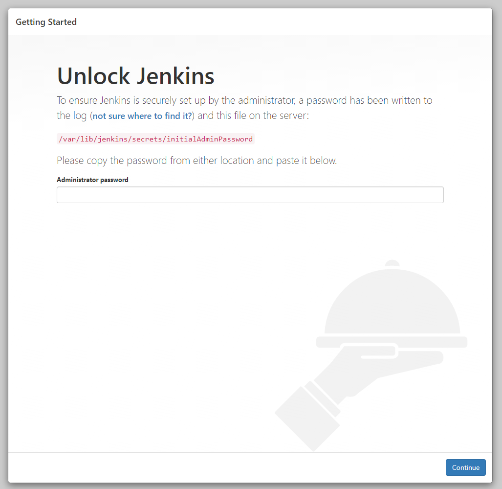 Öncelikle Jenkins bizden admin kullanıcısı olduğumuzu doğrulamamız gerekir. Bunun için de sunucu üzerindeki bir dizine oluşturduğu dosyadan şifreyi almamızı ister.