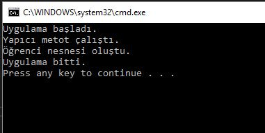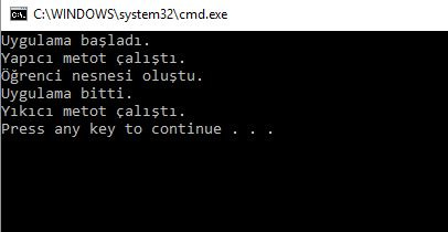 Burada yıkıcı metodumuz “uygulama bitti.” Yazımızdan da sonra çalıştı. Bunun sebebi, oluşturduğumuz yeniOgrenci nesnemiz Main metodu içerisinde geçerli bir nesne. Main nesnesi devam ettiği sürece,bellek alanındaki yerini korumaktadır. Aynı şekilde eğer Ogrenci sınıfımızdan kalıtımımızı başka bir metot içerisinde almış olsaydık, yıkıcı metodumuz içerisinde bulunduğu fonksiyon bittikten sonra çalışacaktı. Burada da main fonksiyonumuz tamamlandıktan sonra yıkıcı metodumuz çalışmış oldu ve ekrana en son kendisine ait mesajı yazdı.